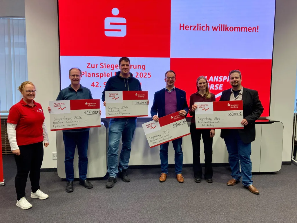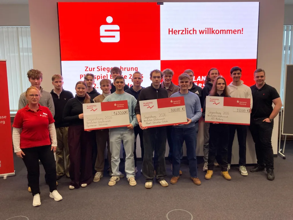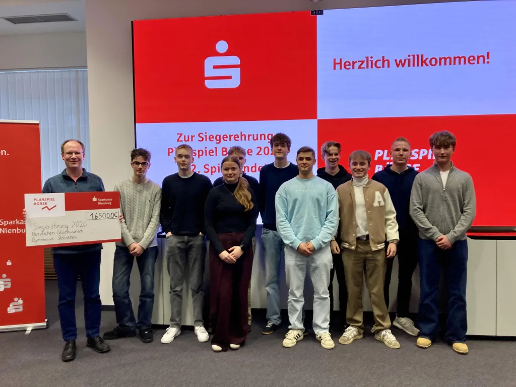 Am Mittwoch, den 11.02.2026 fand die Preisverleihung für das Planspiel Börse 2025 in der Sparkasse Nienburg statt. Insgesamt hatten 34 Teams vom Gymnasium Stolzenau teilgenommen – und dies mit vollem Erfolg. Sechs von zehn Preisen gingen an unsere Schüler/-innen. In beiden Kategorien, der Nachhaltigkeitsbewertung sowie der Depotbewertung, kamen die Siegerteams von unserer Schule. Zusätzlich gab es einen 2. Platz, zwei 3. Plätze und einen 5. Platz. Die zehn Schüler und eine Schülerin haben insgesamt 1650 € erhalten (jeweils pro Team zwischen 150 € und 350 €). Zum Vergleich erhielten die konkurrierenden Schulen insgesamt: IGS 350€, ASS 300€ und MDG 200€.
